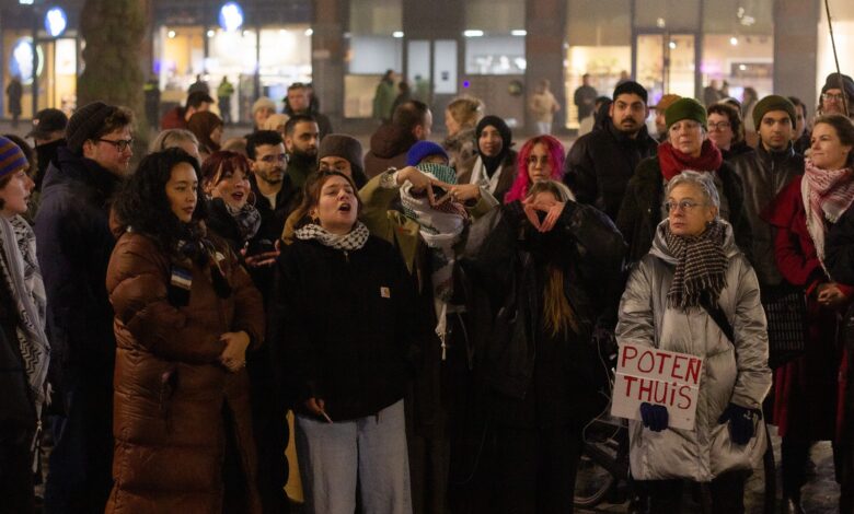 Vredenburg Meydanı’ndan yürüyüşe geçen göstericiler, eylemlerini Utrecht Paardenveld Polis Merkezi önünde sürdürdü.