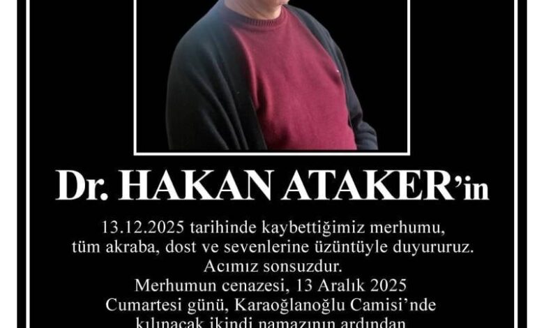 Ailesi tarafından yapılan açıklamada, Dr. Hakan Ataker’in 13 Aralık 2025 tarihinde hayatını kaybettiği bildirildi. Merhumun cenazesi, 13 Aralık 2025 Cumartesi günü Karaoğlanoğlu Camisi’nde kılınacak ikindi namazının ardından Karaoğlanoğlu Mezarlığı’nda toprağa verilecek.