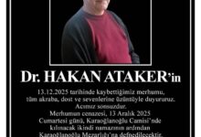 Ailesi tarafından yapılan açıklamada, Dr. Hakan Ataker’in 13 Aralık 2025 tarihinde hayatını kaybettiği bildirildi. Merhumun cenazesi, 13 Aralık 2025 Cumartesi günü Karaoğlanoğlu Camisi’nde kılınacak ikindi namazının ardından Karaoğlanoğlu Mezarlığı’nda toprağa verilecek.