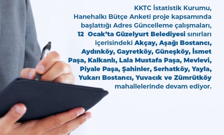 İstatistik Kurumu, “Hanehalkı Bütçe Anketi” projesi kapsamında yapılan adres güncelleme çalışmalarının dün Güzelyurt’ta başladığını duyurdu.
